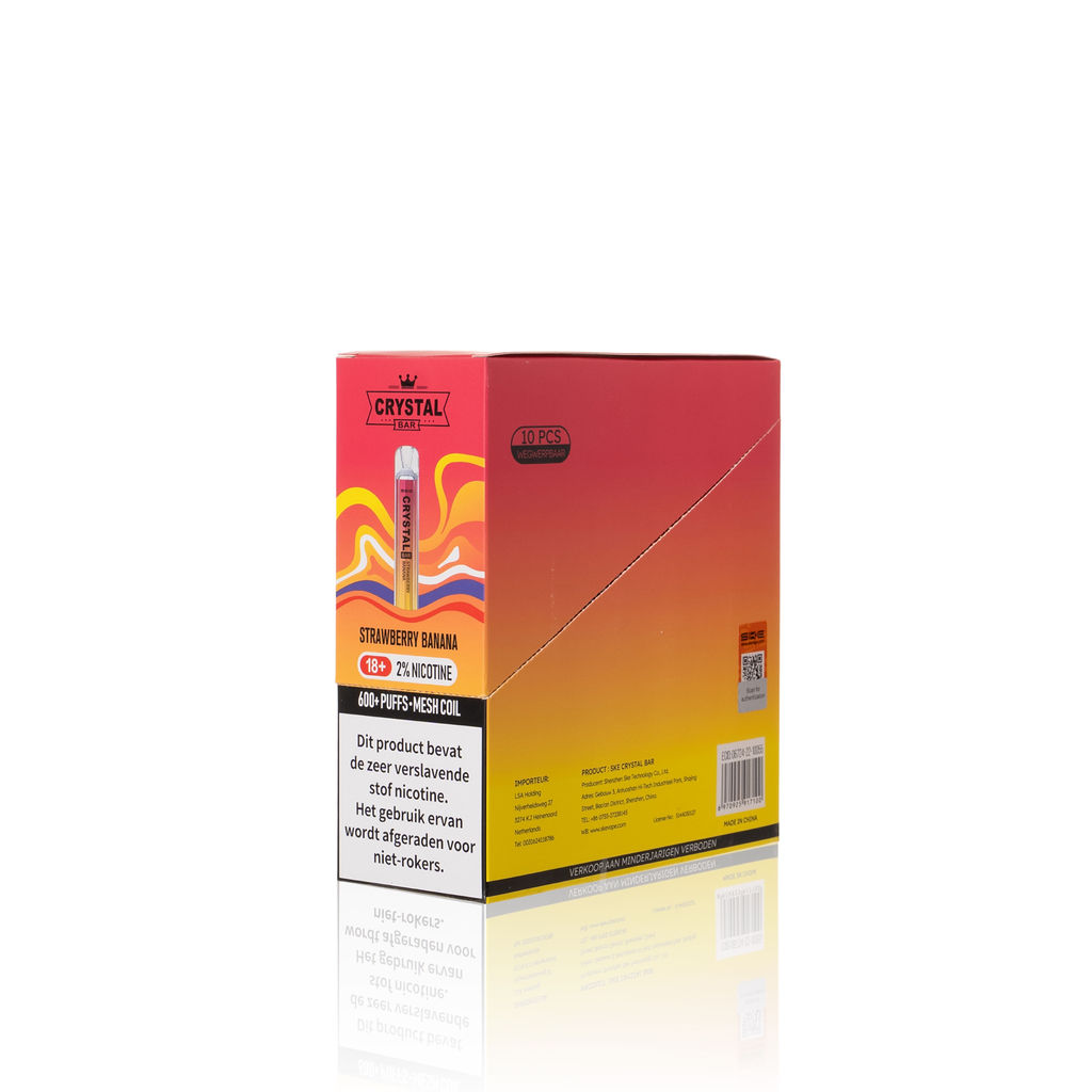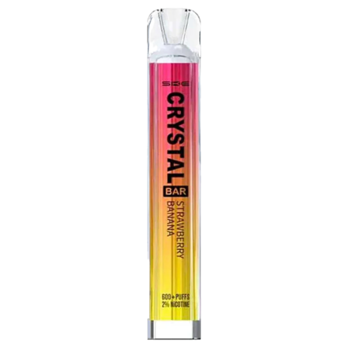 The Strawberry Banana SKE Crystal Bar disposable vape will easily fit into your pocket thanks to its lightweight build and small size, meaning you can take it with you wherever you go. There’s no need to worry about maintenance, because it’s designed to be replaced with a new one when the e-liquid inside is finished. Each SKE Crystal Bar device is prefilled with 2ml of e-liquid, which delivers up to 600 puffs and can outlast 20 cigarettes.
